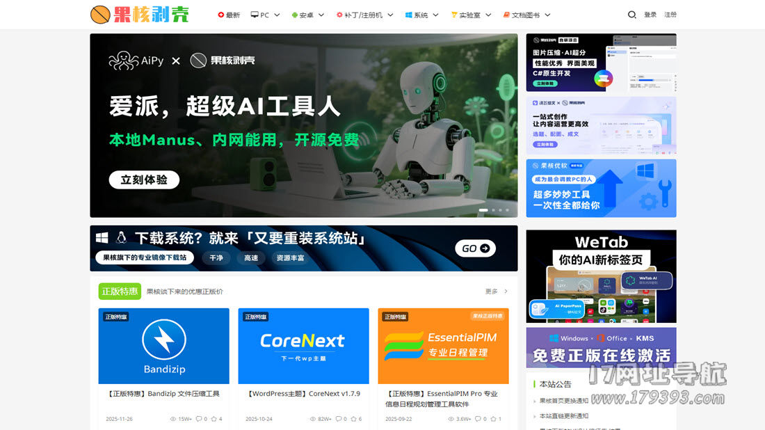 果核剥壳是一个成立于2016年的个人技术博客型资源站,其域名取自"果核"拼音缩写。网站以"还原软件本质"为理念,专注于为用户提供经过去广告、去捆绑、去恶意插件处理的"净化版"软件资源。据站长自述,该站源于高中时期的"果核博客",由一位具备PHP、Android、VUE等全栈开发能力的独立开发者维护。
