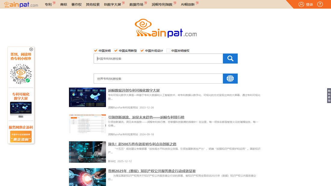 在“加快高水平科技自立自强,引领发展新质生产力”的政策导向下,知识产权的保护与运用已成为创新发展的核心支撑。而rainpat.com(润桐RainPat)作为聚焦专利领域的专业服务平台,凭借前沿技术与精准定位,为各类创新主体搭建起连接专利数据、趋势洞察与合规保护的桥梁,成为科技从业者、企业及知识产权工作者的必备工具。