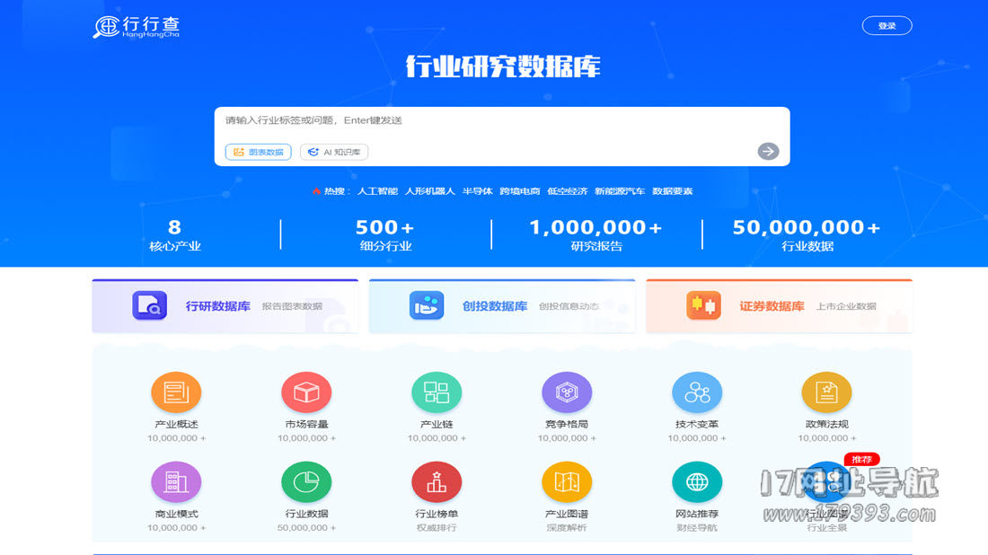 在产业升级与投资决策日益依赖精准数据的当下,行行查(hanghangcha.com)作为聚焦行业研究的综合性数据服务平台,凭借海量的数据储备、专业的研究体系与高效的服务模式,构建了覆盖多领域、全链条的行业信息生态,为企业战略规划、投资者项目研判、从业者行业洞察提供了一站式解决方案,成为连接产业数据与商业决策的核心枢纽。