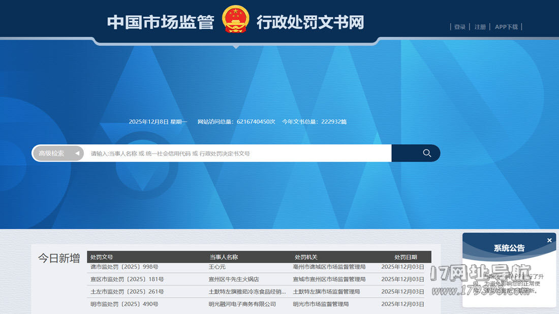1. 核心价值亮点:- 权威性:国家市场监督管理总局统筹建设,数据直接来源于全国各级市场监管部门,处罚信息真实、合规、具有法律效力,区别于第三方平台,是查询市场监管处罚信息的“官方唯一入口”;- 全面性:覆盖全国31个省(区、市),涵盖企业、个体工商户、社会组织等各类市场主体,涉及食品、药品、知识产权等十余类执法领域,累计公示海量处罚记录,满足多维度查询需求;- 实时性:处罚信息按处罚日期实时更新,“今日新增”板块同步最新执法结果,确保用户获取的信息时效性强,避免因信息滞后导致的决策失误;- 公益性:基础查询功能完全免费开放,无需注册登录即可检索,降低公众与企业的信息获取成本,真正实现“执法信息公开惠民”。