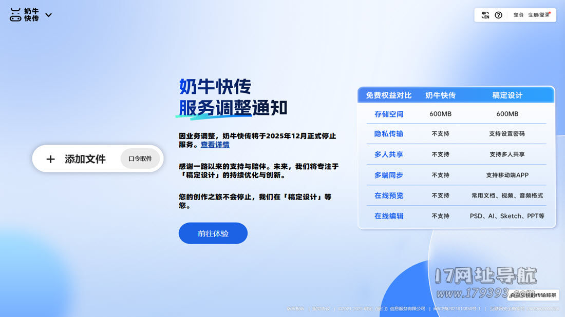 根据平台官方发布的服务调整通知,奶牛快传将于2025年12月正式停止服务。这意味着届时用户将无法再使用该平台的文件传输、存储等相关功能,平台方也明确表示,未来将把研发和运营重心转移至“稿定设计”产品的优化与创新上,原奶牛快传用户的创作与办公需求可转向该产品承接。