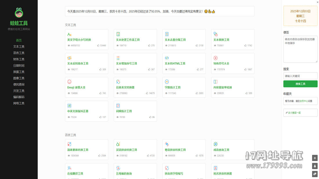 蛙蛙工具的核心优势在于“一站式整合”,它摒弃了单一工具的功能局限,将日常高频使用的各类工具集中归类,涵盖文本处理、语言转换、财务计算、单位换算、便民查询等多个维度。无论是办公族的文档编辑需求、财务人员的数据核算需求,还是普通用户的日常信息查询需求,都能在这里找到对应的解决方案,无需在多个网站间来回切换,大幅节省时间成本。