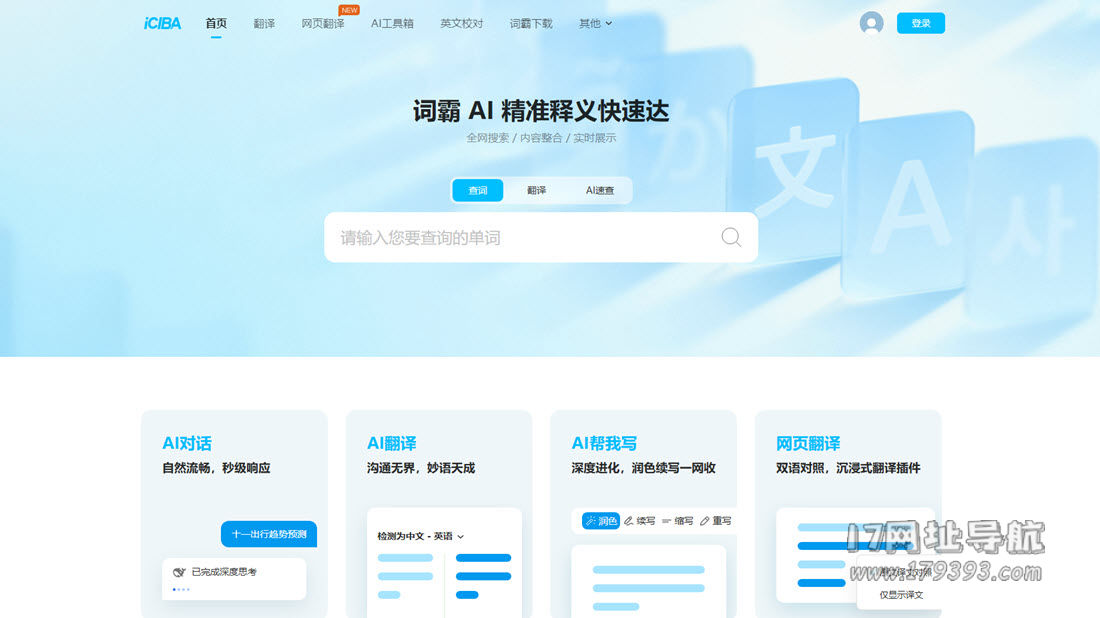 在语言学习、跨语言沟通与内容创作场景中,一款集查词、翻译、写作辅助于一体的高效工具至关重要。iciba.com 作为金山词霸的官方平台,凭借“传统词典优势+AI技术赋能”,构建了涵盖查词释义、多场景翻译、智能写作辅助、语言学习训练的全流程语言服务体系,无论是日常查词、跨语言沟通,还是学术写作润色、语言能力提升,都能提供精准便捷的解决方案,成为数亿用户信赖的语言工具平台。