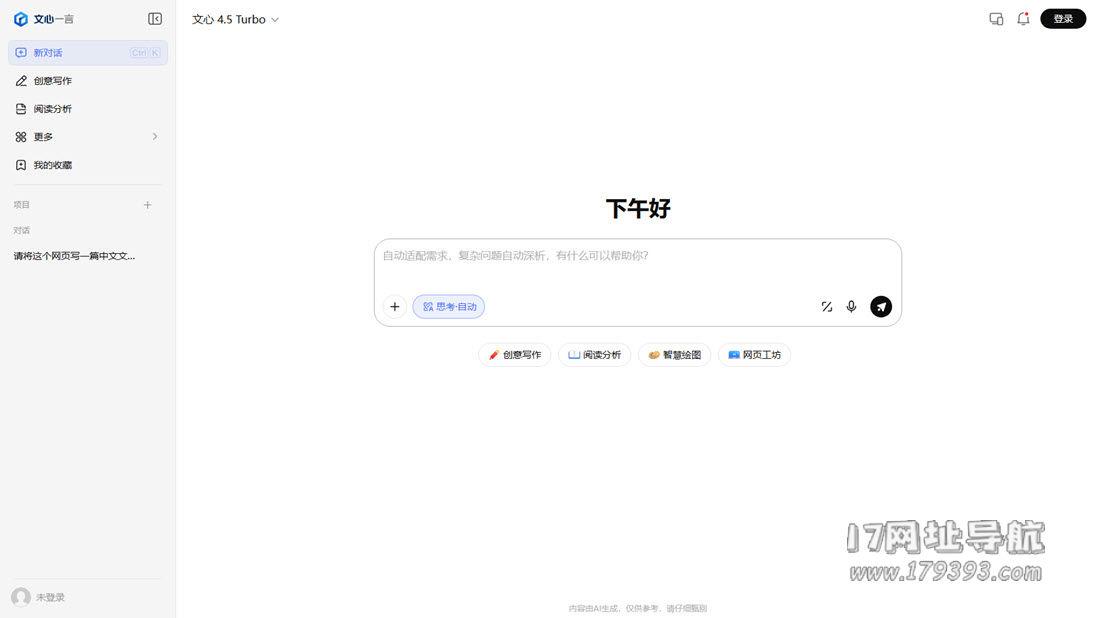 官网无需下载客户端,通过浏览器访问即可直接使用,界面设计简洁清晰:顶部为输入框(支持文本输入与语音唤醒),中部实时展示生成内容,右侧可调用“百度搜索”“览卷文档”“E言易图”等原生插件,底部则提供“历史记录”“创作模板”等功能入口,新手用户也能快速上手。
