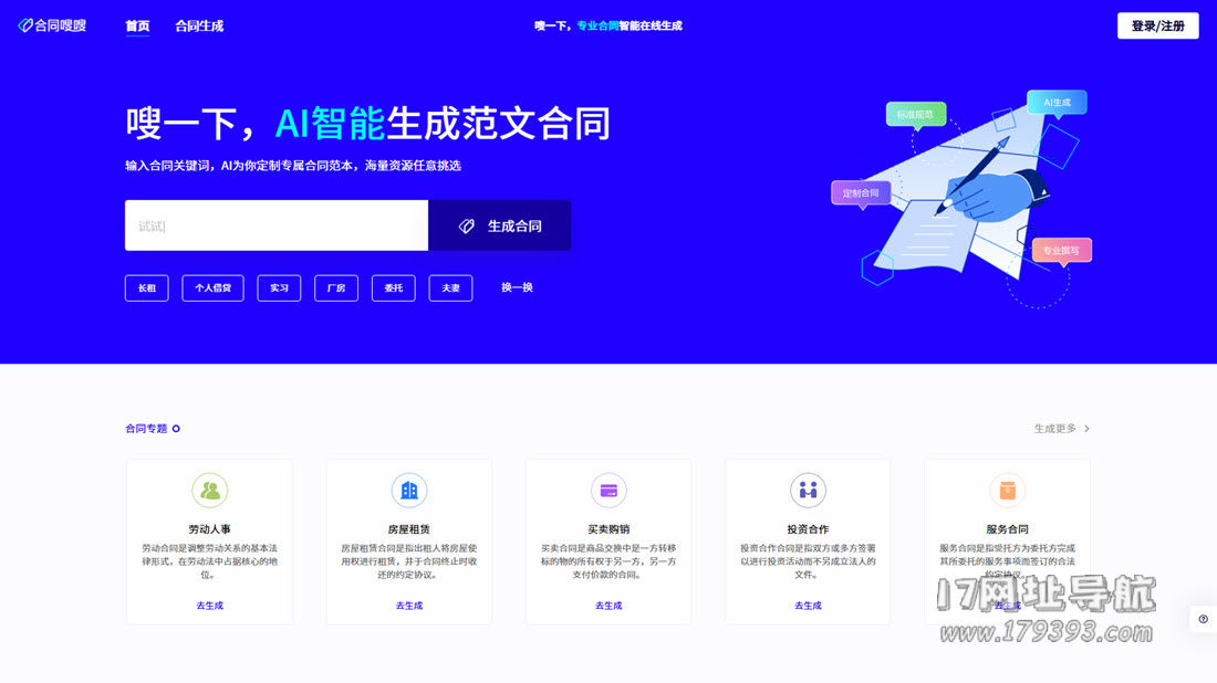 合同嗖嗖的核心功能围绕AI智能合同生成展开,提供了多种使用方式和合同类型选择。网站首页最显眼的部分是合同生成区域,用户可以在输入框中输入合同关键词,系统会根据这些关键词生成定制化的合同范本。平台特别举例说明:“试试输入‘珠海 个人 房屋’”,展示了其根据地域、主体类型和合同性质生成针对性合同的能力。