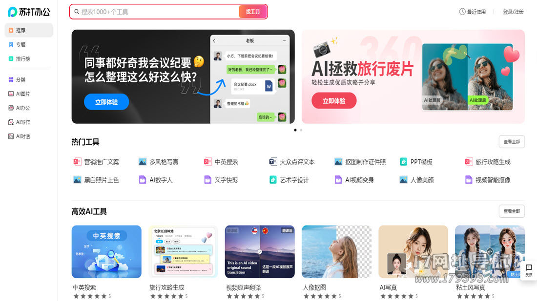 打开苏打办公网站,简洁的界面立刻呈现眼前,最显眼的位置是“最近使用的工具”区域,智能去水印、快剪辑、字幕导出等常用功能一目了然。这里不只是一个工具,而是整合了AI视频生成、PDF转换、图片处理等上百款办公效率应用的在线平台,大部分功能无需下载软件,点击即用。
